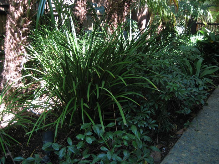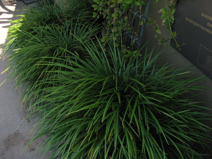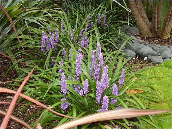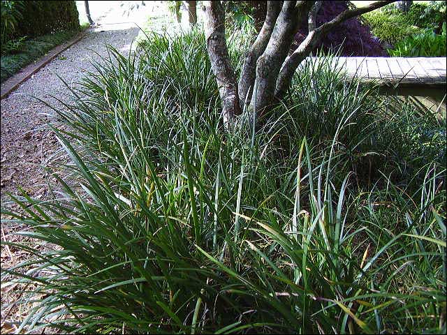 An attractive evergreen perennial ground cover with arching grass-like foliage. Abundant blue flower spikes rise above the foliage in summer. Grows to a height of 60 cm. Useful as a groundcover, under trees and shrubs and suits massed planting.