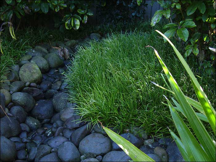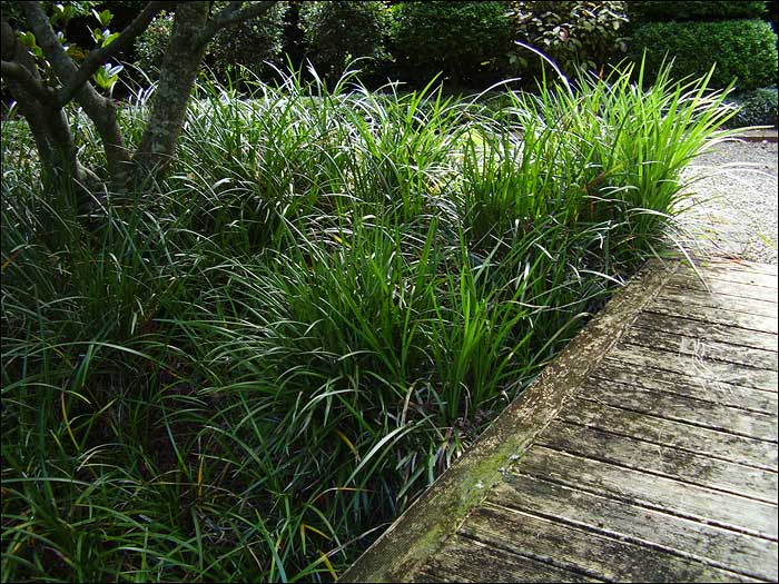Evergreen grass with finer dark green leaves than the other varieties. Makes a beautiful dense mat with lilac flowers in summer. Grows to a height of 45 cm. Superb as weed suppressing ground cover, for in-filling, under planting and minimising erosion.