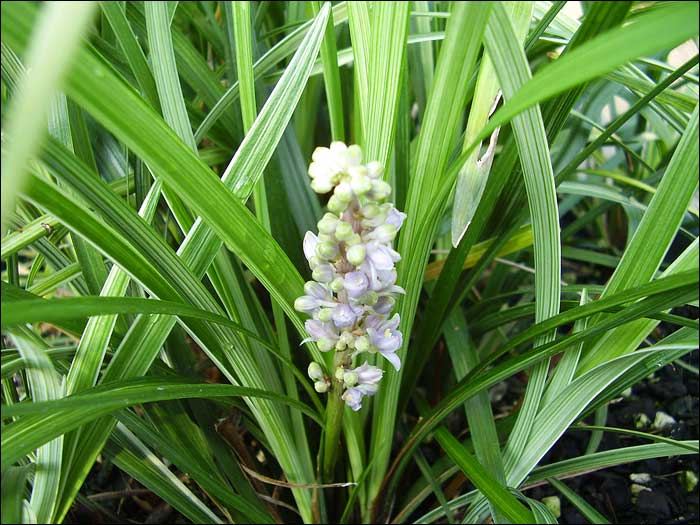 This evergreen perennial forms clumps of gold edged arching leaves with lavender flower spikes. The leaves are wider than other muscari varieties. Grows to a height of 35 cm. It is an excellent groundcover and as an accent plant.