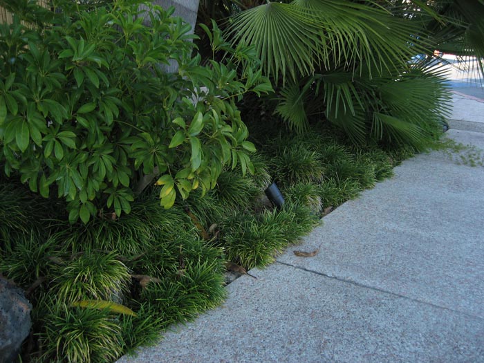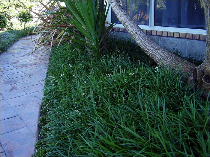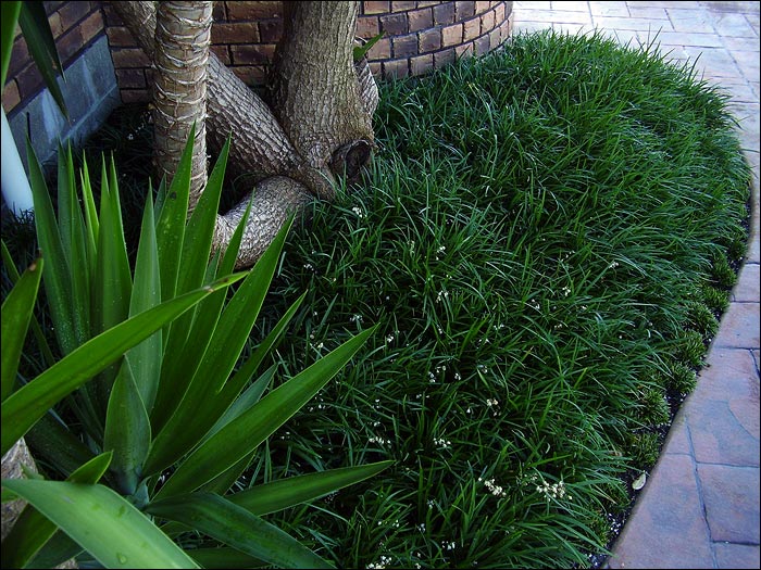 Plants are tufted, grass-like with erect to arching green leaves growing from 4-40 cm high, depending on the variety. The leaves of Mondo grass are narrower than Liriope and the smaller flowers are generally hidden by the foliage. The depth of foliage colour will depend on the amount of light and shade. Flowers are usually white or white tinged with lilac. Mondo grasses grow well in ordinary garden soil requiring minimum attention once established.